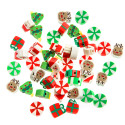 Beads with Christmas motifs made of polymer clay. They depict Christmas designs such as Christmas trees, reindeer, Santa Clauses, presents and red and green Christmas candies.