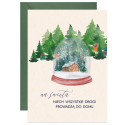Christmas card with an illustration of a Christmas landscape, Christmas trees and a snow globe with a wooden house. The card is empty inside and is waiting for your wishes. The card is sold together with a colored envelope. The card will bring joy to your loved ones, who will find it in the mailbox or with the Christmas gift.