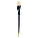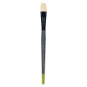 These brushes are easy to clean and highly durable, even when used on rough painting surfaces. Their synthetic fibers do not absorb water, which makes them particularly effective when working with thicker acrylic paints. The short, ergonomically shaped wooden handle in gray with a lime-green tip fits comfortably in the hand and ensures comfort even during long hours at the easel.