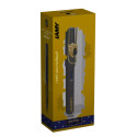 The body is made from durable ABS plastic (or metal in selected models), with a sturdy metal clip for attaching to notebooks or pockets. The stainless steel nib provides smooth, precise writing. Compatible with Lamy T10 ink cartridges and the Z28 converter, it offers flexible refilling options.