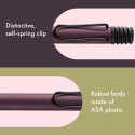 Its body is made of durable, high-gloss ASA plastic, with a flattened shape to prevent rolling off desks. The ergonomically shaped grip ensures comfort during extended writing. The distinctive spring-loaded clip allows the pen to be securely attached to notebooks or pockets.