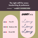 The pen comes with a LAMY M 16 ballpoint refill in medium size (M) in black, providing smooth and precise writing. Perfect for notes, sketches, school, or office use.