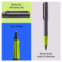 The pen’s body is made from lightweight, anodized aluminum coated in an elegant aubergine finish. Its transparent ABS grip section ensures comfort and control while writing, and the sturdy spring-loaded metal clip allows secure attachment to a notebook or pocket. The pen comes equipped with a black LAMY M63 refill, providing smooth and consistent ink flow. A stylish and functional choice for those who appreciate comfort, refined aesthetics, and German precision.