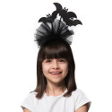 Halloween hairband with black tulle and three bats. There's a lot going on with this unusual headband. A black tiara of tulle decorated with a small rose will please any elegant witch, while three black bats will leave no doubt whose head the headband crowns. The headband will be the perfect prop to complete a costume for a Halloween party, carnival, costume ball or themed party. It will work well as an accessory for children as well as adults.