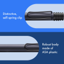 Korpus wykonano z odpornego, wysokopołyskowego plastiku ASA, a spłaszczony kształt zapobiega przypadkowemu staczaniu się długopisu z biurka. Ergonomicznie wyprofilowany uchwyt zapewnia komfort podczas długotrwałego pisania. Charakterystyczny, sprężynujący klips pozwala pewnie przypiąć długopis do notesu lub koszulki.
