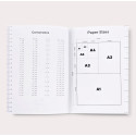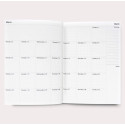 Notes Numero posiada abstrakcyjny nadruk na okładce i kontrastową kolorową okładkę wewnętrzną. Na każdy dzień tygodnia została przeznaczona jedna cała strona, weekend na jednej, wspólnej stronie. Dziennik 2 strony na tydzień i 2 strony na każdy miesiąc.