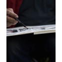 Papier w notesie jest bezkwasowy, odporny na falowanie przy użyciu farb wodnych i minimalizuje efekt przebijania. Charakterystycznym elementem szkicownika jest odkryty, zszywany bawełnianą nicią grzbiet, który nadaje mu prostą, nowoczesną formę, a jednocześnie pozwala otwierać notes całkowicie płasko na każdej stronie. Każdy egzemplarz szyty i klejony jest ręcznie przy użyciu kleju PVA na bazie wody, co gwarantuje trwałość i elastyczność.