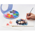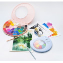Farby mają dobrą pigmentację, rozpuszczają się w wodzie z łatwością i pozwalają uzyskać czyste, wyraziste odcienie. Paleta obejmuje szeroki wybór barw – od podstawowych, przez pastele, aż po ciemniejsze tony – co daje duże możliwości twórcze zarówno dla początkujących, jak i dla hobbystów. Zestaw jest poręczny, praktyczny i stanowi doskonały wybór do codziennych projektów akwarelowych. Farby można swobodnie mieszać, uzyskując szeroką gamę odcieni, a po wyschnięciu łatwo reaktywować wodą, co znacznie wydłuża czas ich użytkowania. Farby są nietoksyczne i bezrozpuszczalnikowe.