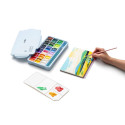 Taki rodzaj opakowania chroni farby przed wysychaniem, utrzymuje ich świeżość i sprawia, że są zawsze gotowe do użycia. Farby mają gęstą, kremową konsystencję, dzięki czemu łatwo się rozprowadzają, a intensywne napigmentowanie pozwala uzyskać wyraziste krycie już przy pierwszej warstwie. Bogata paleta kolorów daje ogromne możliwości twórcze – od prostych ilustracji po rozbudowane obrazy i projekty artystyczne. Farby można swobodnie mieszać, uzyskując szeroką gamę odcieni, a po wyschnięciu łatwo reaktywować wodą, co znacznie wydłuża czas ich użytkowania. Farby są nietoksyczne i bezrozpuszczalnikowe.