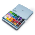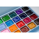 Taki rodzaj opakowania chroni farby przed wysychaniem, utrzymuje ich świeżość i sprawia, że są zawsze gotowe do użycia. Farby mają gęstą, kremową konsystencję, dzięki czemu łatwo się rozprowadzają, a intensywne napigmentowanie pozwala uzyskać wyraziste krycie już przy pierwszej warstwie. Bogata paleta kolorów daje ogromne możliwości twórcze – od prostych ilustracji po rozbudowane obrazy i projekty artystyczne. Farby można swobodnie mieszać, uzyskując szeroką gamę odcieni, a po wyschnięciu łatwo reaktywować wodą, co znacznie wydłuża czas ich użytkowania. Farby są nietoksyczne i bezrozpuszczalnikowe.